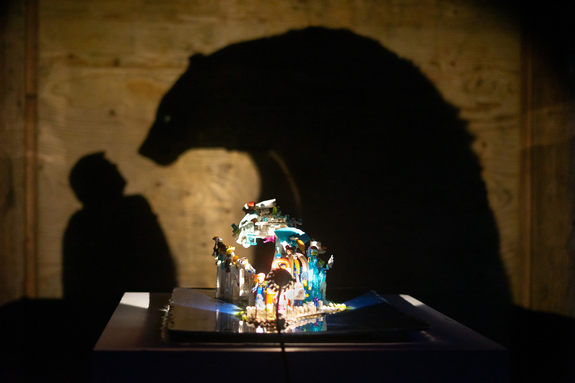 The work is a LEGO-based shadow sculpture shaped like Greenland seen from above. When illuminated, the sculpture casts a shadow showing an uncertain political figure facing a much larger polar bear. The shadow emphasizes a distortion os scale, reflecting the tension between greedy and naive desires for control and the reality of nature and sovereignty. The work explores the childish mechanisms of power - wanting what belongs to others, reacting with frustration when denied. LEGO as a material highlights play, construction, and oversimplification, but is also a strong reference to Denmark.
